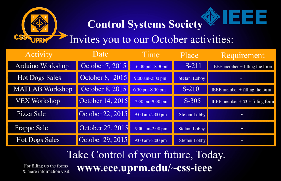 Welcome to the Control Systems Society's Mayagüez chapter's official webpage! Here, you will find up to date information on the organization. If you are already a member, to take part in our activities, click on the "Register Now" link at the bottom of the page.