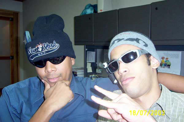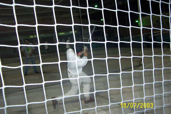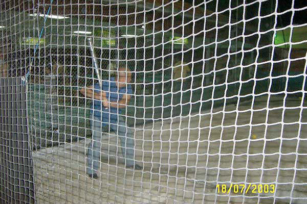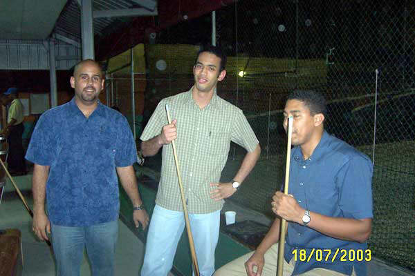 De izq, Elvis el jefe sentao, Jorge posando pa la camara y yo atras sentado en el stool. Detras de esas mayas es que estan las maquinas de batear. |